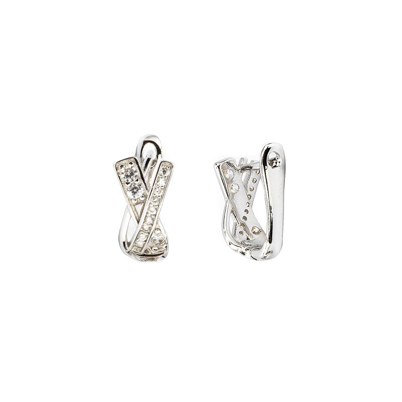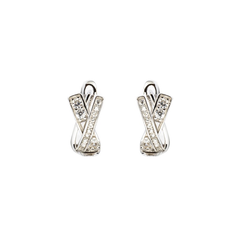 Srebrne kolczyki Shiny Ribbon. Plecione, błyszczące, przecinające się w połowie wstęgi. Solidne i idealne na każdą okazję. Udekorowane mieniącymi się białymi cyrkoniami. Wykonane z lśniącego srebra próba 925. Fabrycznie nowe.
