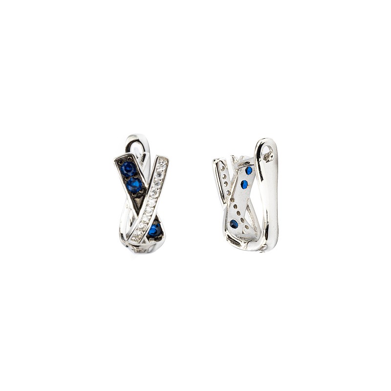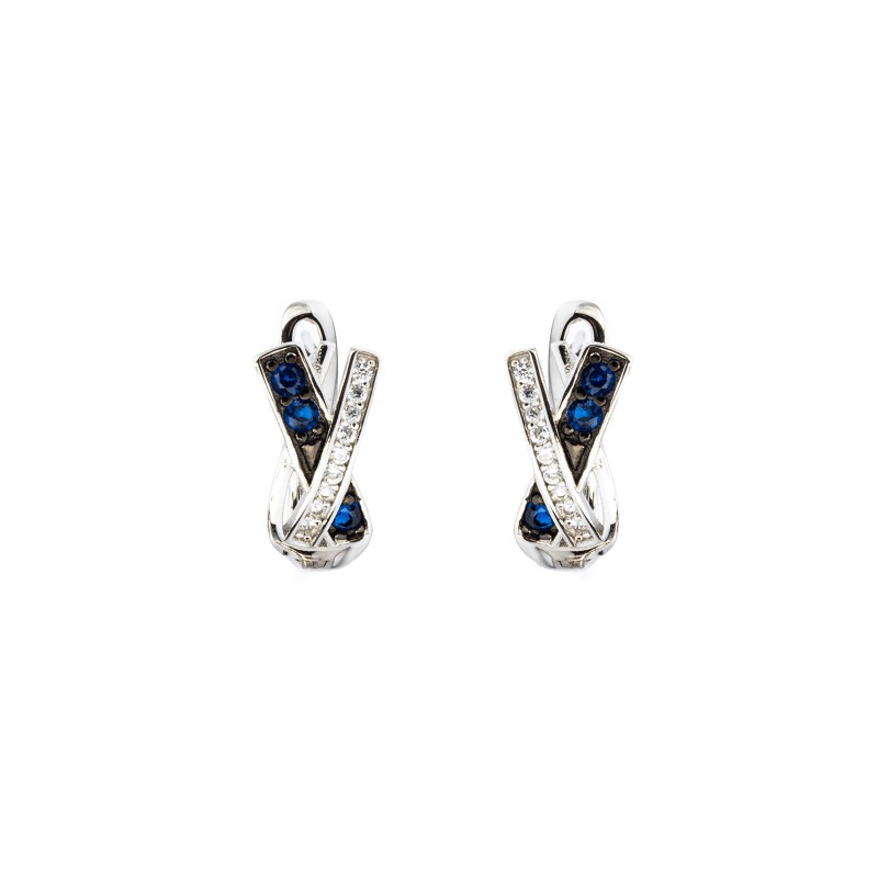 Srebrne kolczyki Shiny Ribbon. Plecione, błyszczące, przecinające się w połowie wstęgi. Solidne i idealne na każdą okazję. Udekorowane mieniącymi się białymi i niebieskimi cyrkoniami. Wykonane z lśniącego srebra próba 925. Fabrycznie nowe.