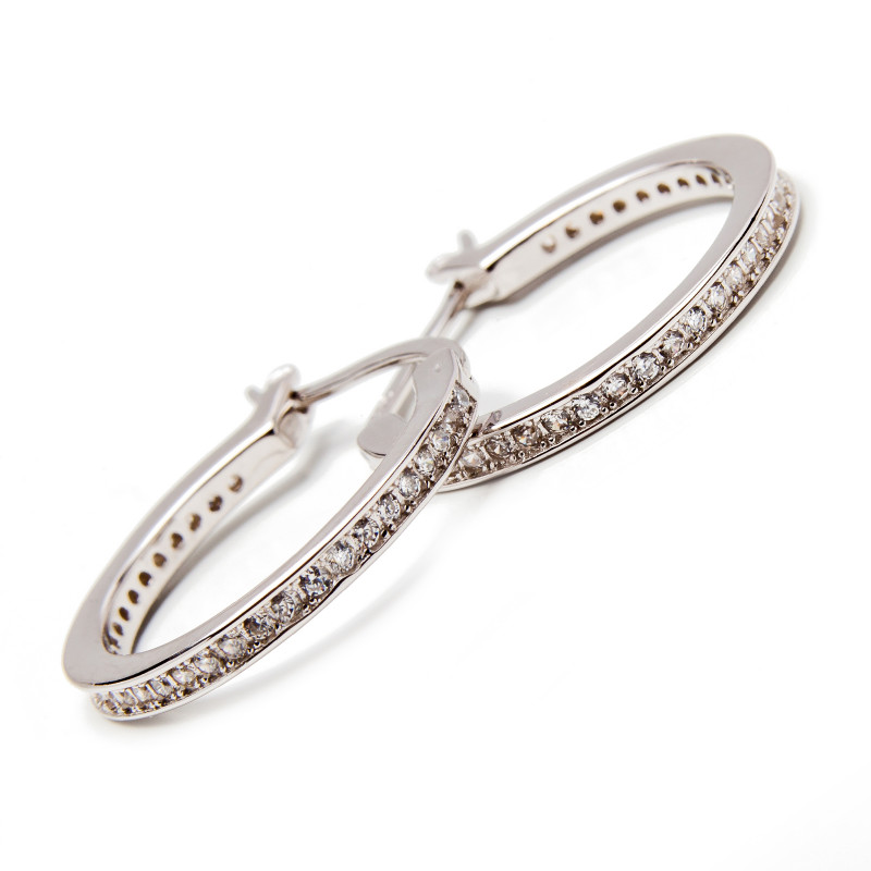 Srebrne kolczyki kółka z białymi cyrkoniami. Wykonane z lśniącego srebra próba 925. Fabrycznie nowe.