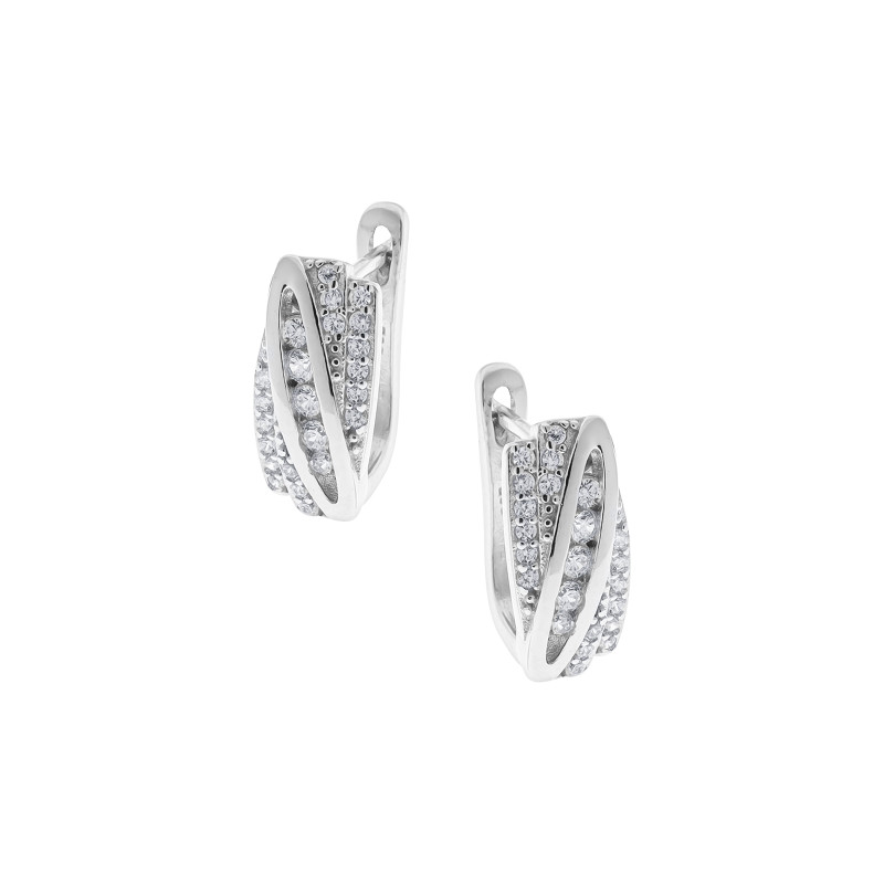 Eleganckie kolczyki srebrne próby 925 z angielskim zapięciem. Cienki, subtelny owal zdobią rzędy białych cyrkonii – po bokach i w środku, tworząc harmonijny, błyszczący akcent. Minimalistyczna forma łączy nowoczesną elegancję z delikatnym luksusem, dzięki czemu kolczyki świetnie sprawdzą się zarówno na co dzień, jak i na wyjątkowe okazje.