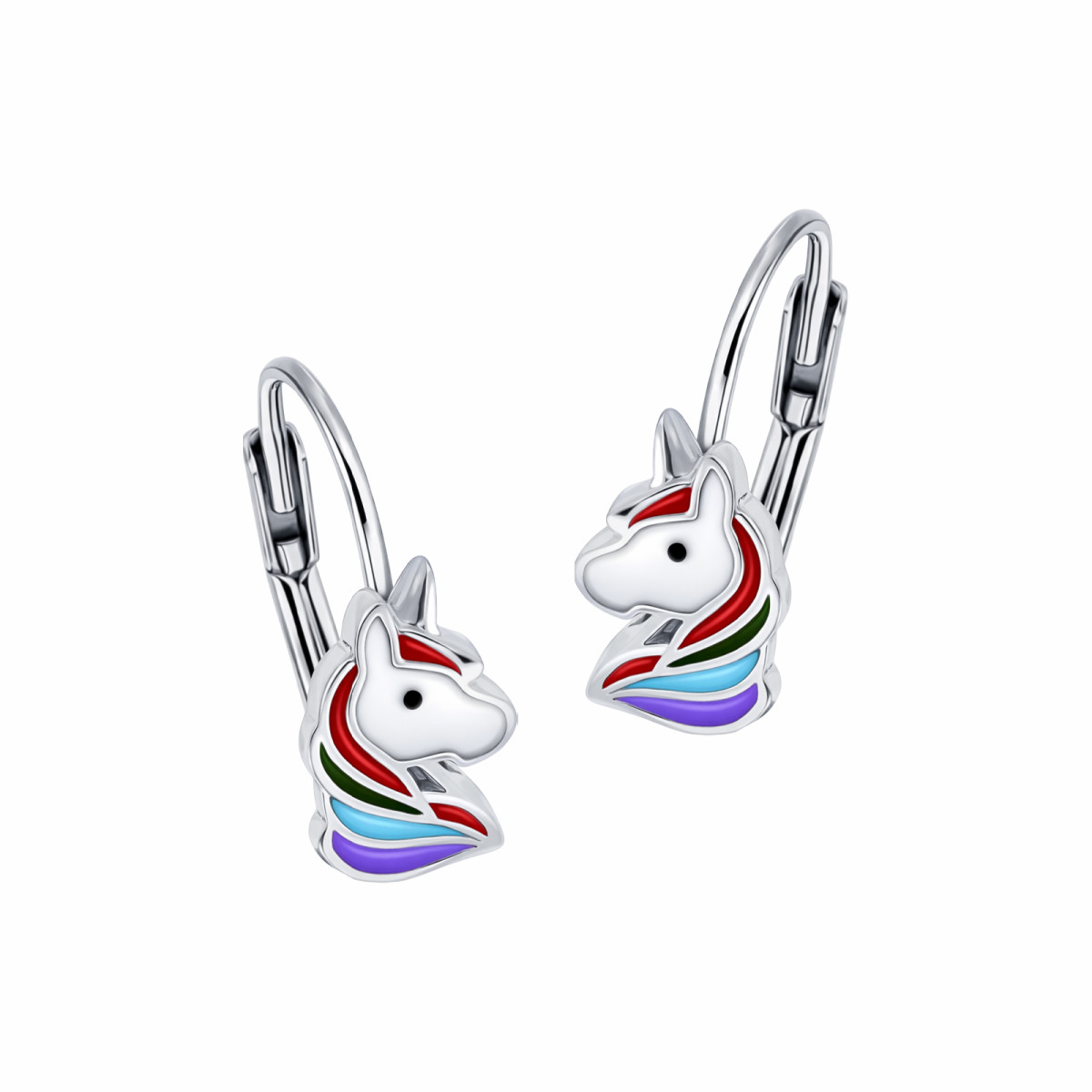 Urocze kolczyki wykonane ze srebra próby 925 przedstawiają bajkowy motyw jednorożca, który zachwyca delikatnym kształtem oraz kolorowymi zdobieniami.