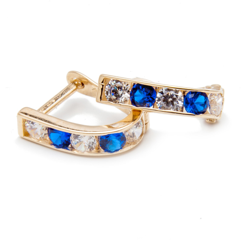 Złote kolczyki z granatowymi i białymi cyrkoniami. Wykonane z lśniącego złota próba 585. Fabrycznie nowe.