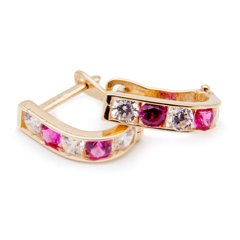 Złote kolczyki z różowo białymi cyrkoniami. Wykonane z lśniącego złota próba 585. Fabrycznie nowe.