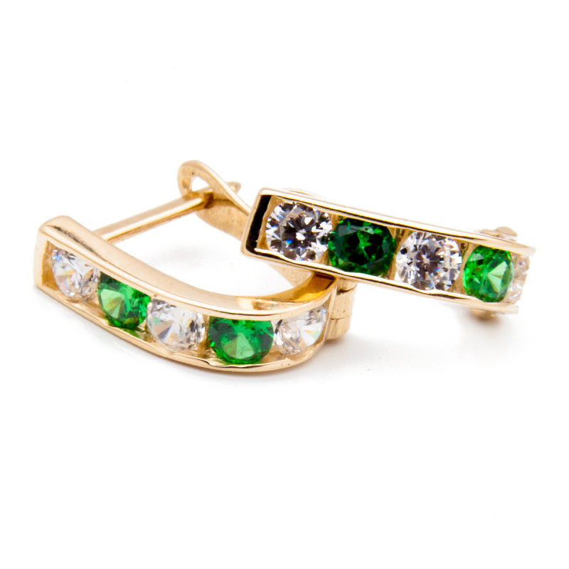 Złote kolczyki z zielonymi i białymi cyrkoniami. Wykonane z lśniącego złota próba 585. Fabrycznie nowe.