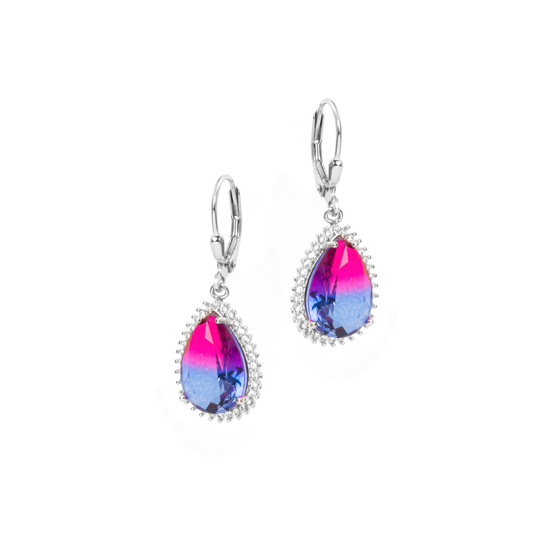 Srebrne wiszące kolczyki w kształcie kropli przypominające kolorami zorzę polarną