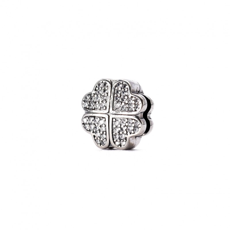 Srebrny płaski charms z motywem koniczyny szczęścia wyłożonej białymi cyrkoniami. Wykonany z najwyższej jakości lśniącego srebra próba 925. Zapinany na wygodne zapięcie, klips. Fabrycznie nowy.