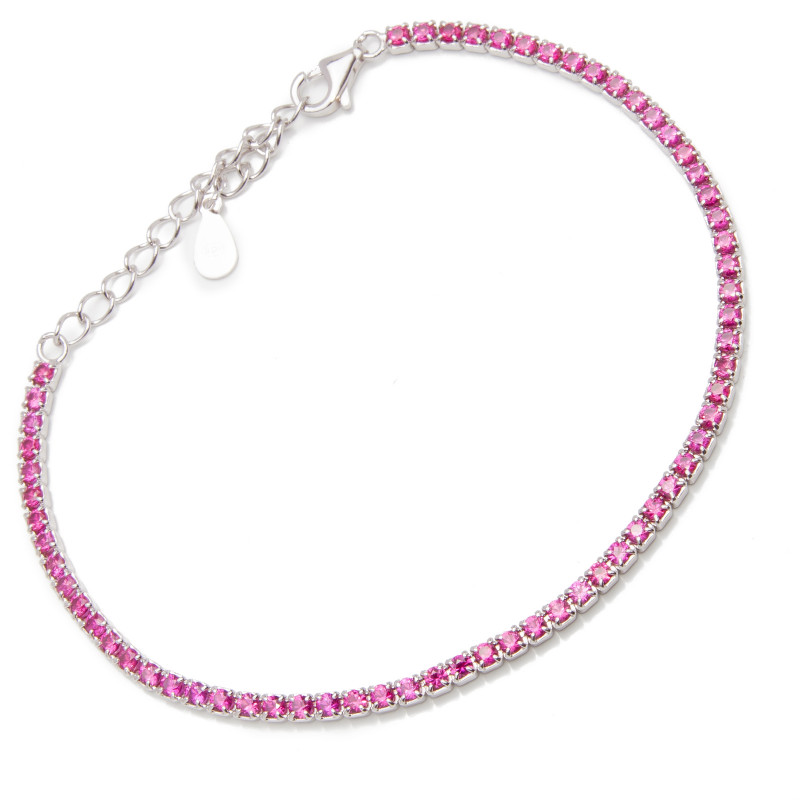 Srebrna bransoletka na rękę, damska z różowymi cyrkoniami. Wykonana z lśniącego srebra próby 925. Bransoletka ma możliwość regulacji długości.