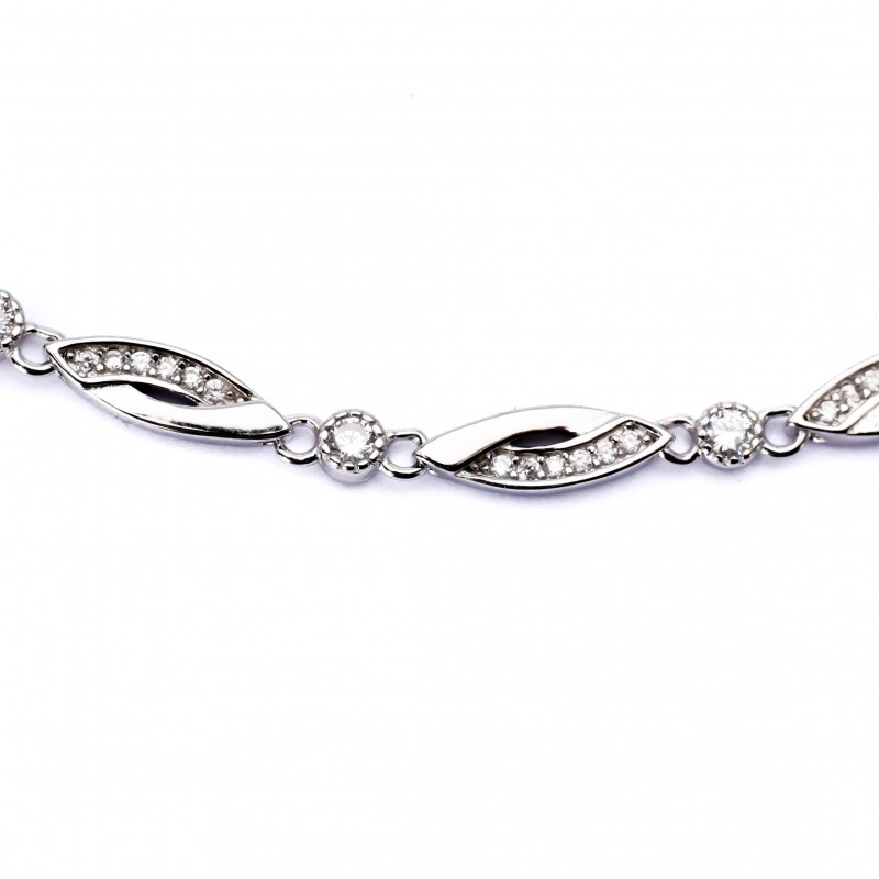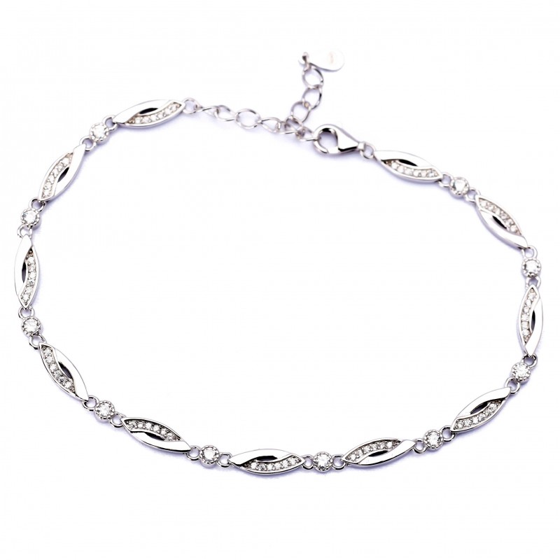 Srebrna bransoletka z przeplatającymi się błyszczącymi łukami wyłożonymi białymi cyrkoniami. Wykonana z najwyższej jakości lśniącego srebra próby 925. Fabrycznie nowa.