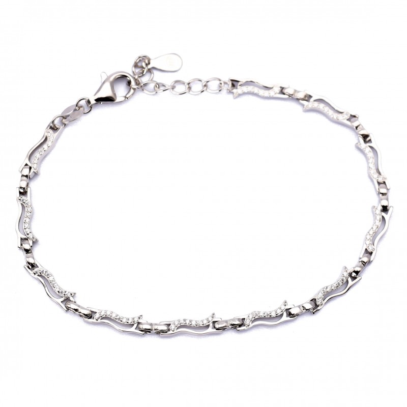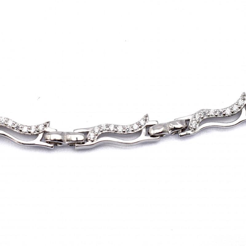 Srebrna bransoletka z wzorzystymi falami wyłożonymi białymi cyrkoniami. Wykonana z najwyższej jakości lśniącego srebra próby 925. Fabrycznie nowa.