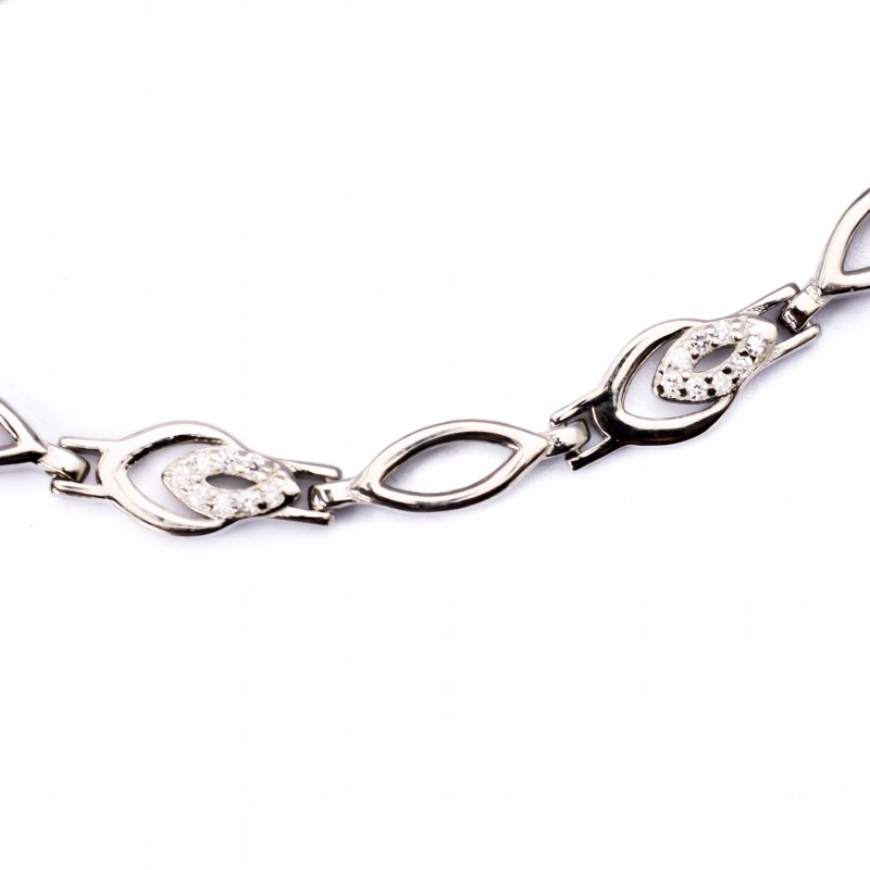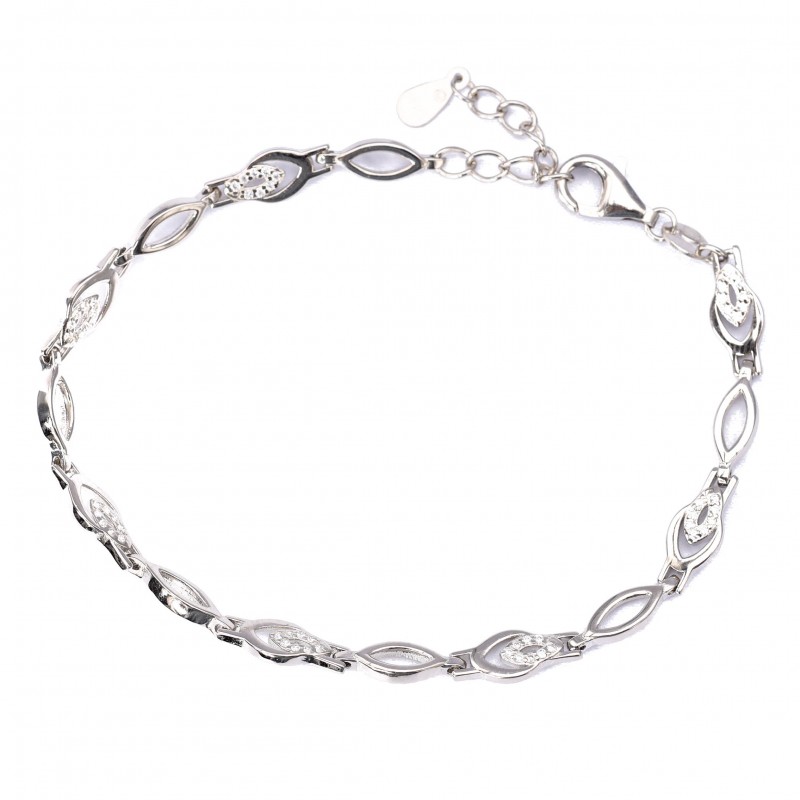Srebrna bransoletka ułożona z ogniw z motywem pawich oczek udekorowanych białymi cyrkoniami. Wykonana z najwyższej jakości lśniącego srebra próby 925. Fabrycznie nowa.
