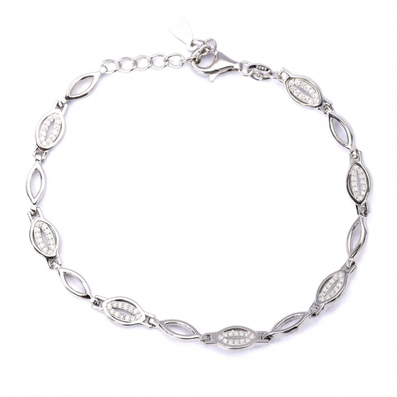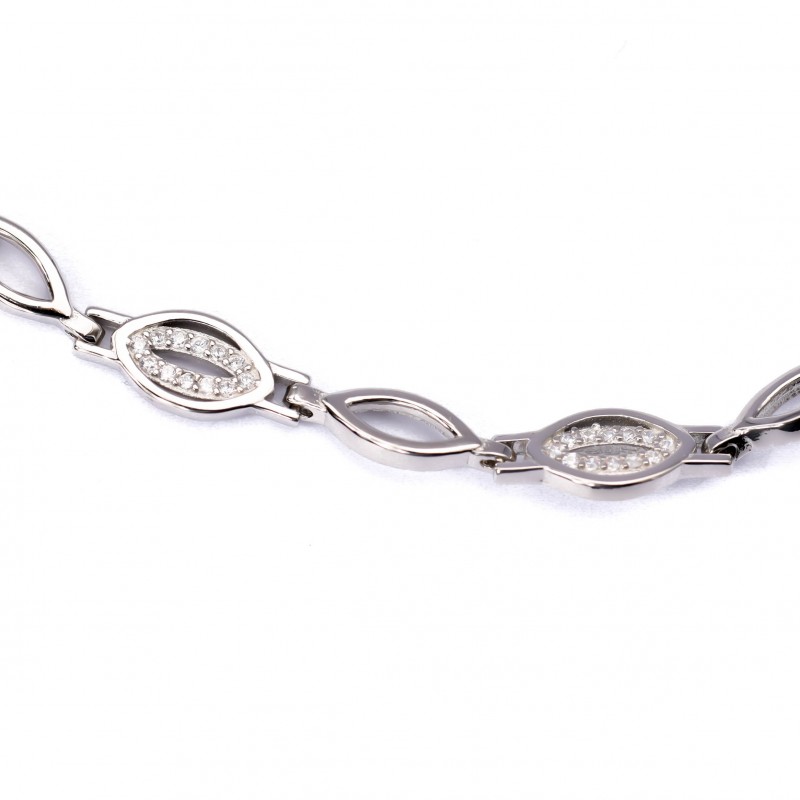 Srebrna bransoletka ułożona z ogniw z motywem łez udekorowanych białymi cyrkoniami. Wykonana z najwyższej jakości lśniącego srebra próby 925. Fabrycznie nowa.