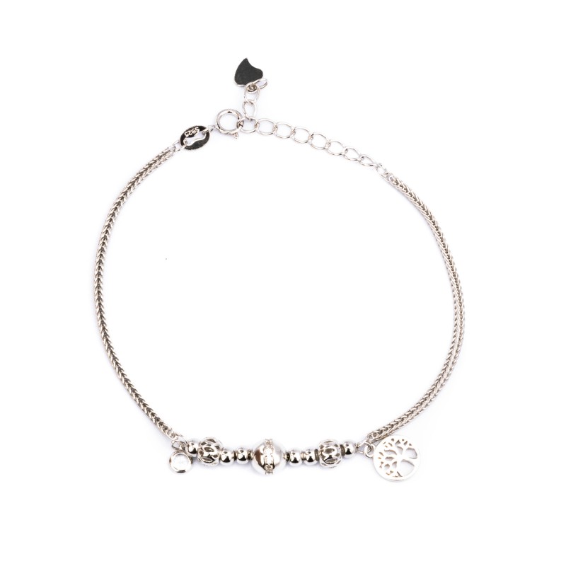 Srebrna bransoletka wykonana z dwóch grubych, solidnych, srebrnych łańcuszków o splocie typu lisi ogon ze srebrnymi kulkami i drzewkiem szczęścia pośrodku. Wykonana z najwyższej jakości srebra próby 925. Fabrycznie nowa.