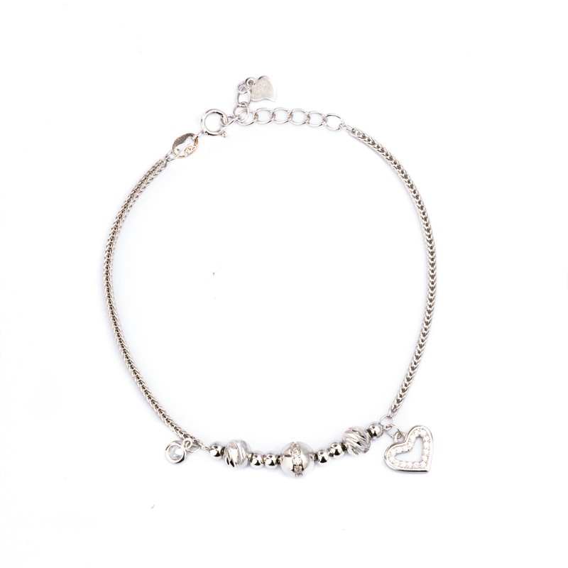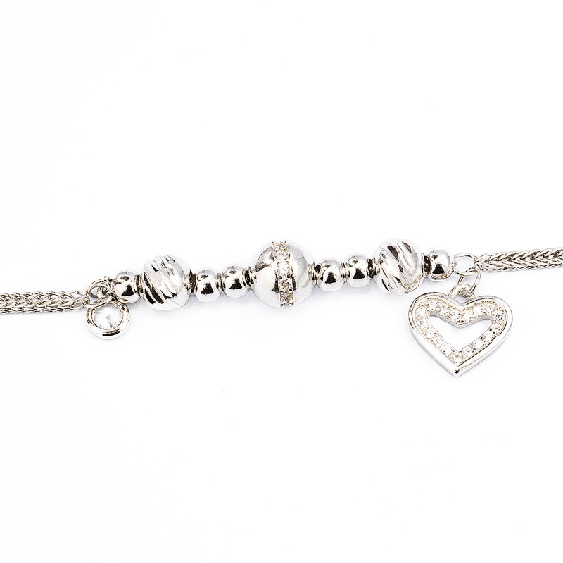 Srebrna bransoletka wykonana z dwóch grubych, solidnych, srebrnych łańcuszków o splocie typu lisi ogon ze srebrnymi kulkami i serduszkiem pośrodku. Zawieszka jest dodatkowo wypełniona białymi cyrkoniami. Wykonana z najwyższej jakości srebra próby 925. Fabrycznie nowa.