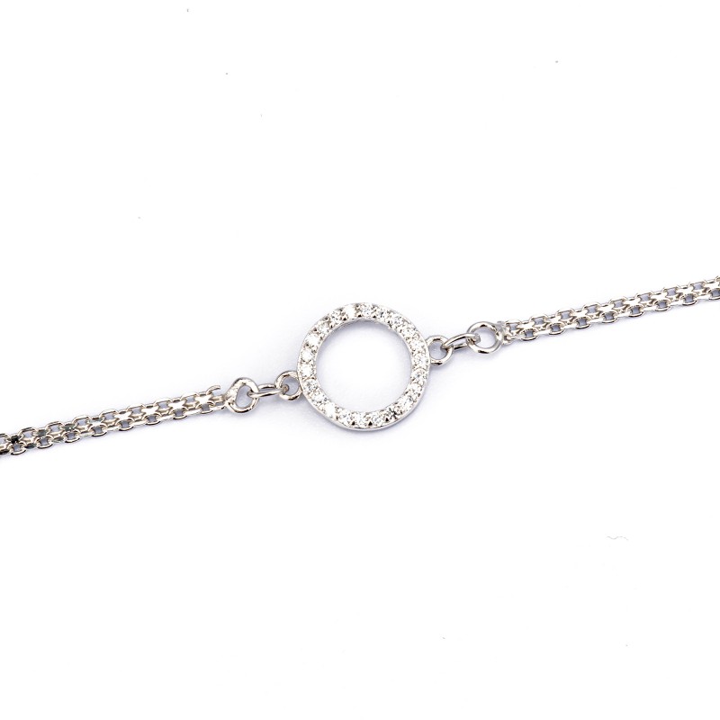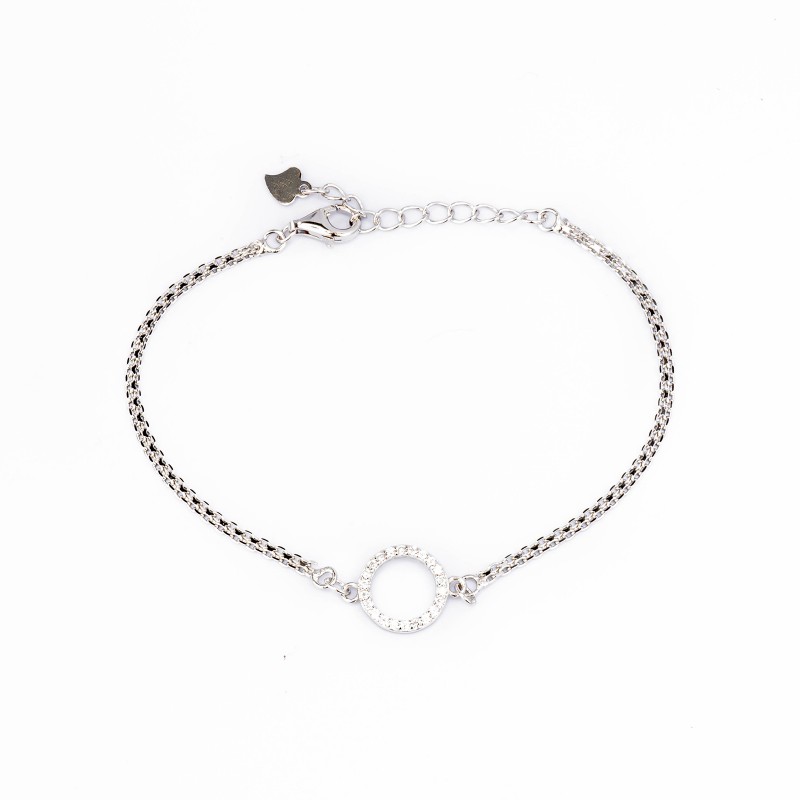 Srebrna bransoletka z okręgiem wypełnionym białymi cyrkoniami. Wykonana z najwyższej jakości srebra próby 925. Fabrycznie nowa.