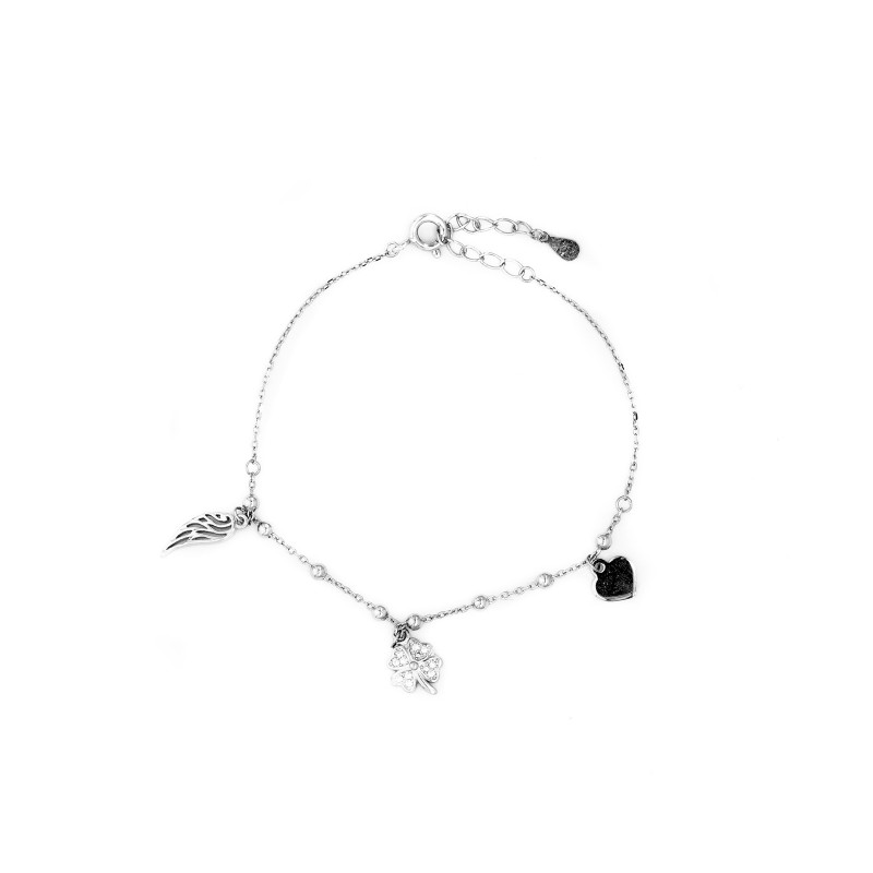 Srebrna bransoletka z motywem serca, skrzydła i błyszczącej czterolistnej koniczyny udekorowanej białymi cyrkoniami. Wykonana z najwyższej jakości lśniącego srebra próby 925. Fabrycznie nowa.