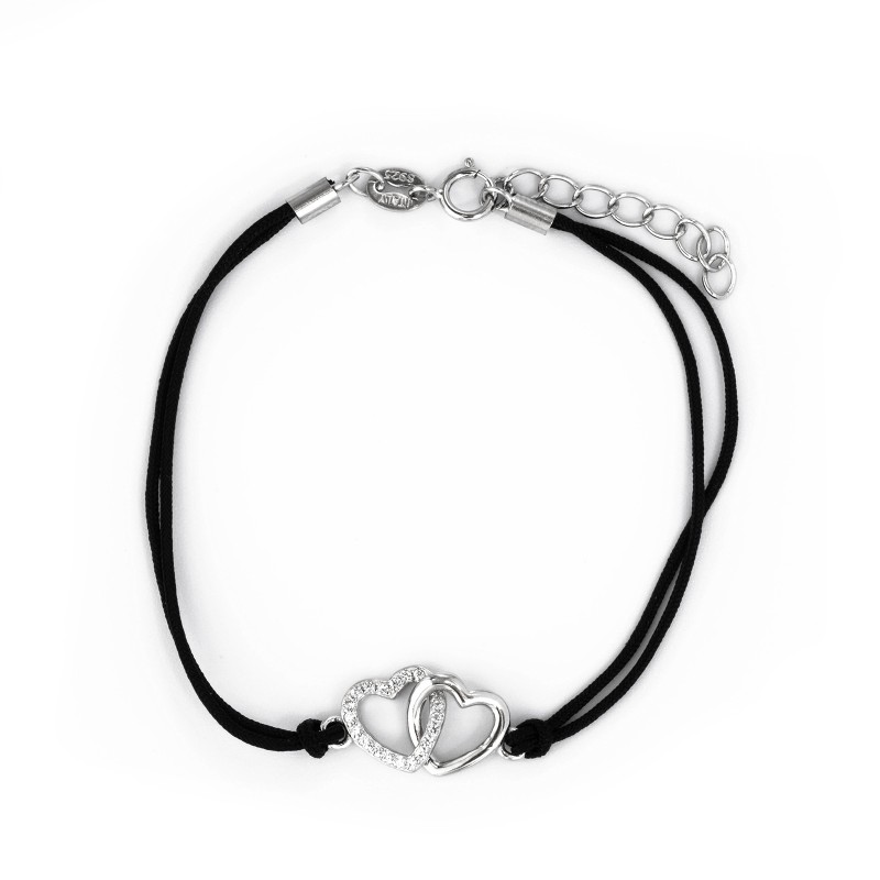 Srebrna bransoletka 925 Przeplatane Serca Czarny Sznurek