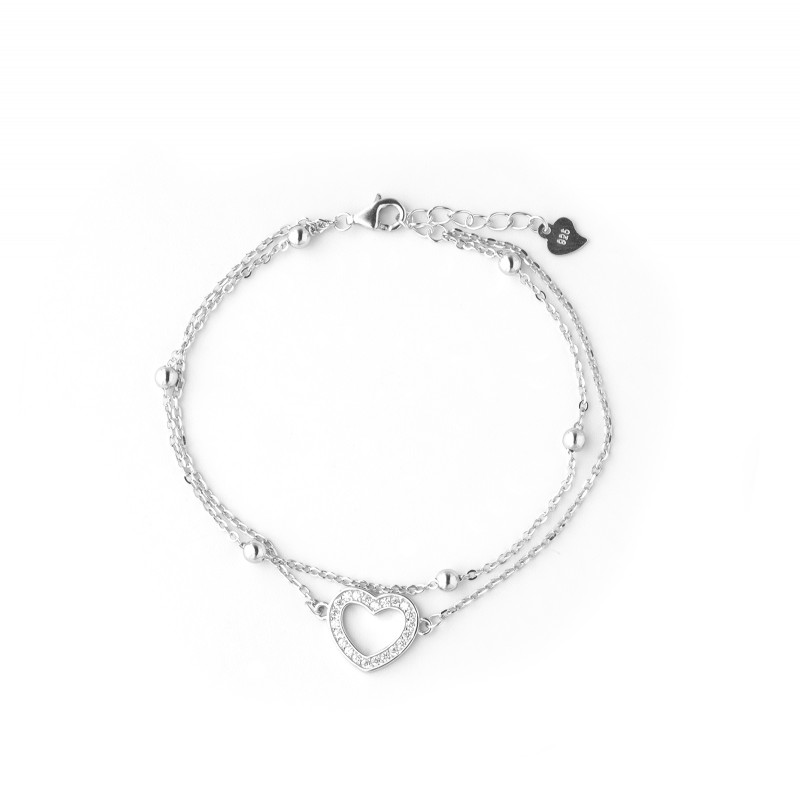 Srebrna podwójna bransoletka z motywem serca z cyrkoniami