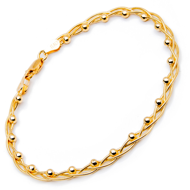 Srebrna pozłacana bransoletka z plecionymi kulkami. Wykonana z najwyższej jakości lśniącego pozłacanego srebra próby 925. Fabrycznie nowy.