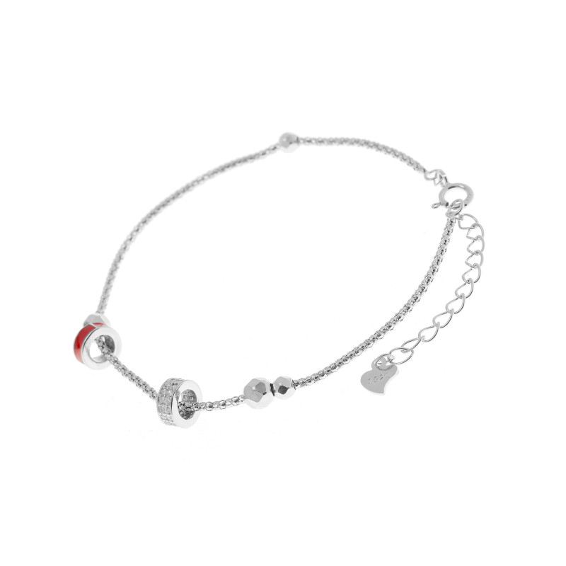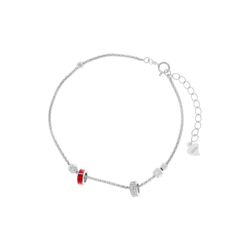 Elegancka srebrna bransoletka próby 925 z delikatnym łańcuszkiem i wyjątkowymi zawieszkami. Ozdobiona błyszczącymi cyrkoniami oraz stylowym czerwonym elementem, który dodaje charakteru i wyrazistości. Dodatkowe srebrne koraliki podkreślają jej subtelny, ale efektowny design. Regulowane zapięcie zapewnia idealne dopasowanie do nadgarstka, a urocza zawieszka w kształcie serca dodaje jej wyjątkowego uroku. To idealna biżuteria dla kobiet ceniących klasykę z nutą nowoczesności. Doskonały pomysł na prezent dla bliskiej osoby!