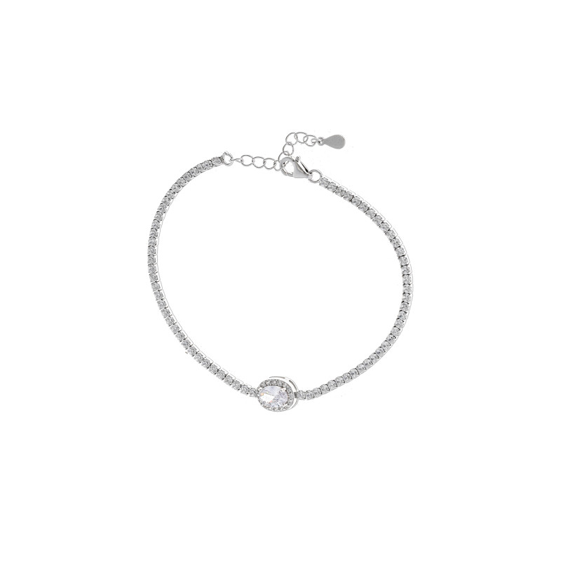 Zachwycająca bransoletka wykonana ze srebra próby 925 to kwintesencja elegancji i blasku. Cała powierzchnia ozdobiona jest lśniącymi cyrkoniami, które pięknie odbijają światło. Centralnym punktem kompozycji jest owalna, duża biała cyrkonia, przyciągająca wzrok swoją wyjątkową czystością. Otoczona drobnymi, błyszczącymi kamieniami tworzy efekt luksusowej biżuterii z najwyższej półki. Idealna na wyjątkowe okazje, ale także jako codzienny akcent klasy i szyku. Doskonały pomysł na prezent, który podkreśli wyjątkowość osoby obdarowanej.