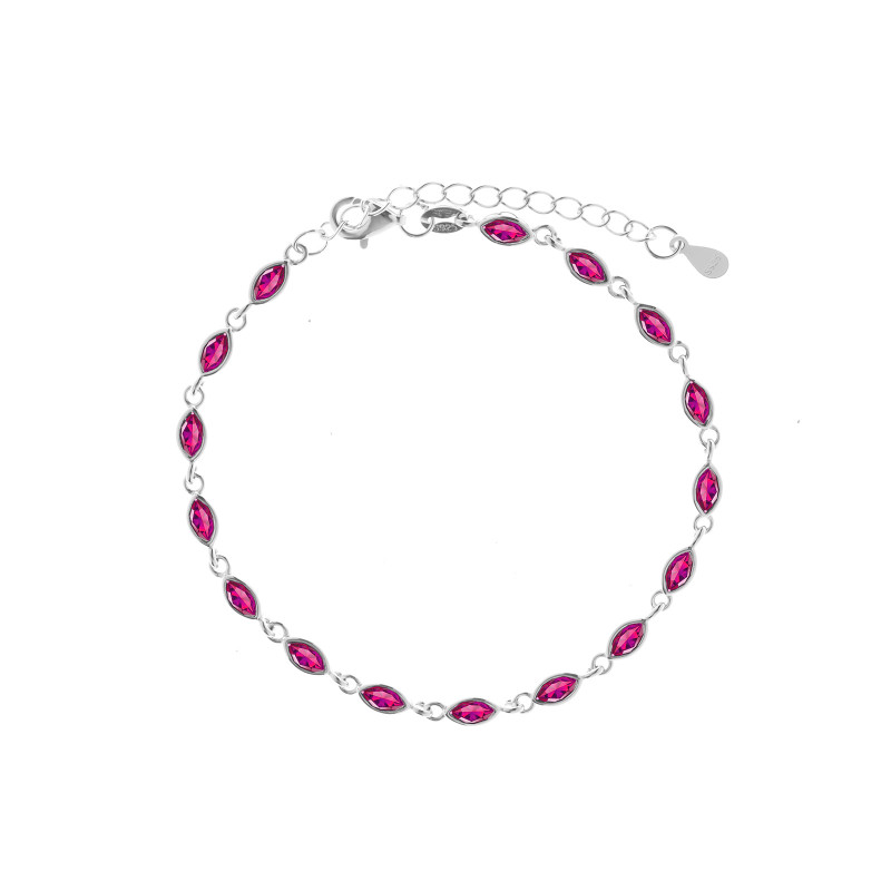 Elegancka bransoletka wykonana ze srebra próby 925 to wyraz klasy i wyjątkowego stylu. Jej całą długość zdobią drobne, migoczące cyrkonie w intensywnym, różowym odcieniu. Każdy kamień został oszlifowany w kształt łezki, co nadaje bransoletce subtelnej lekkości i wyjątkowego blasku. Delikatna forma i wyrazisty kolor sprawiają, że bransoletka przyciąga spojrzenia, jednocześnie zachowując elegancki charakter. Regulowane zapięcie umożliwia idealne dopasowanie do nadgarstka. To doskonała propozycja dla kobiet ceniących połączenie nowoczesnego designu z klasyczną elegancją.