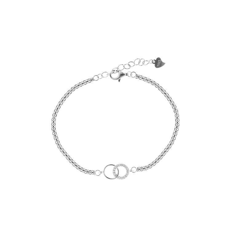 Subtelna i nowoczesna bransoletka wykonana ze srebra próby 925, ozdobiona dwoma połączonymi kołami – symbolem więzi, harmonii i nieskończoności. Jedno koło ma gładką, lśniącą powierzchnię, drugie zostało wysadzane połyskującymi cyrkoniami, które pięknie odbijają światło. Bransoletka z regulowanym łańcuszkiem, idealna jako elegancki dodatek na co dzień lub prezent o głębokim znaczeniu.