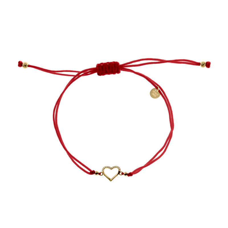 Ta stylowa bransoletka na czerwonym sznurku zachwyca elegancją i symboliką. Jej centralnym elementem jest srebrne, pozłacane serce, delikatne w formie i subtelnie ozdobione rzędem drobnych, lśniących cyrkonii na górnej krawędzi. Złocona powierzchnia pięknie kontrastuje z intensywną czerwienią sznurka, tworząc harmonijne połączenie klasyki i nowoczesności. Blask cyrkonii dodaje całości delikatnego, luksusowego akcentu. Regulowane zapięcie zapewnia wygodne dopasowanie do każdego nadgarstka. To biżuteria z przesłaniem – symbol miłości, bliskości i wyjątkowych emocji. Idealna na prezent lub jako osobisty talizman – romantyczna, subtelna i pełna znaczenia.