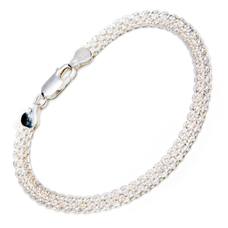 Srebrna bransoletka o splocie typu Bismarck. Wykonana z najwyższej jakości lśniącego srebra próby 925. Fabrycznie nowa.