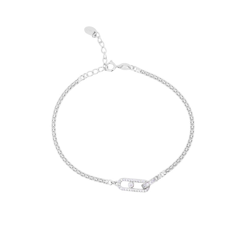 Srebrna bransoletka wykonana ze srebra próby 925 zachwyca subtelnym i eleganckim wzornictwem. Centralnym elementem jest prostokąt ozdobiony cyrkoniami na krawędziach, w którego środku umieszczono pojedynczą, małą cyrkonię, nadając całości delikatnego blasku i wyrafinowanego charakteru. Precyzyjne wykonanie i staranne oprawy podkreślają wysoką jakość biżuterii. Bransoletka jest lekka i wygodna w noszeniu, doskonale układa się na nadgarstku. Jej minimalistyczny, a jednocześnie efektowny design sprawia, że świetnie sprawdzi się zarówno na co dzień, jak i podczas wyjątkowych okazji. To elegancki dodatek, który doda subtelnego uroku każdej stylizacji.