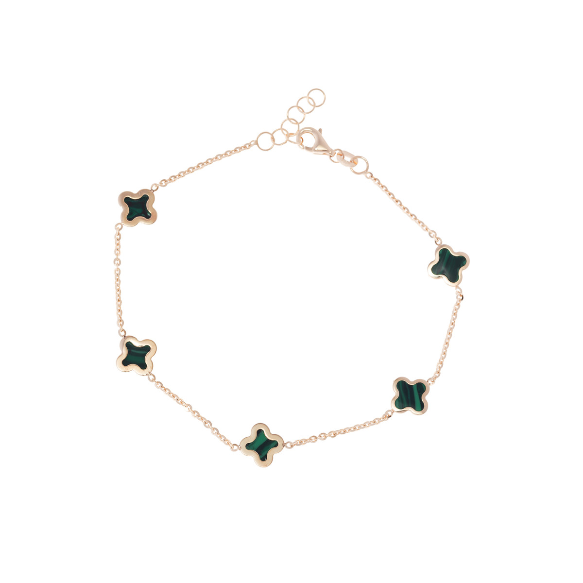 Złota bransoletka próby 585 zachwyca subtelną formą i eleganckim wykończeniem. Delikatny łańcuszek w kolorze ciepłego złota ozdobiony jest pięcioma koniczynkami z ciemnozielonym wypełnieniem, które pięknie kontrastuje z połyskiem metalu. Motywy o gładkich, zaokrąglonych krawędziach nadają biżuterii nowoczesny, a zarazem ponadczasowy charakter. Regulowane zapięcie z przedłużką pozwala idealnie dopasować bransoletkę do nadgarstka. To stylowy i kobiecy dodatek, który subtelnie podkreśli każdą stylizację – zarówno codzienną, jak i elegancką.