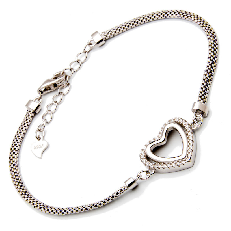 Wysokiej jakości srebrna bransoletka o splocie typu bismarck z motywem serca ozdobionego cyrkoniami. Ręcznie wykonana z najwyższej jakości lśniącego srebra próby 925. Fabrycznie nowa.