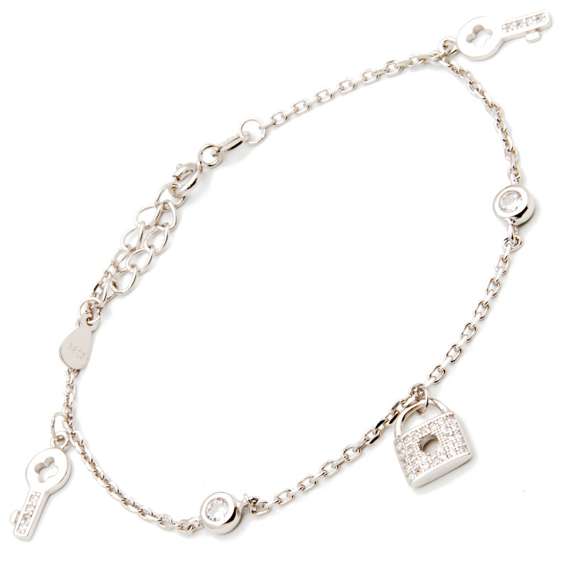 Srebrna bransoletka o splocie typu ankier i zawieszkami z motywem klucza i kłódki. Wykonana z najwyższej jakości lśniącego srebra próby 925. Fabrycznie nowy.