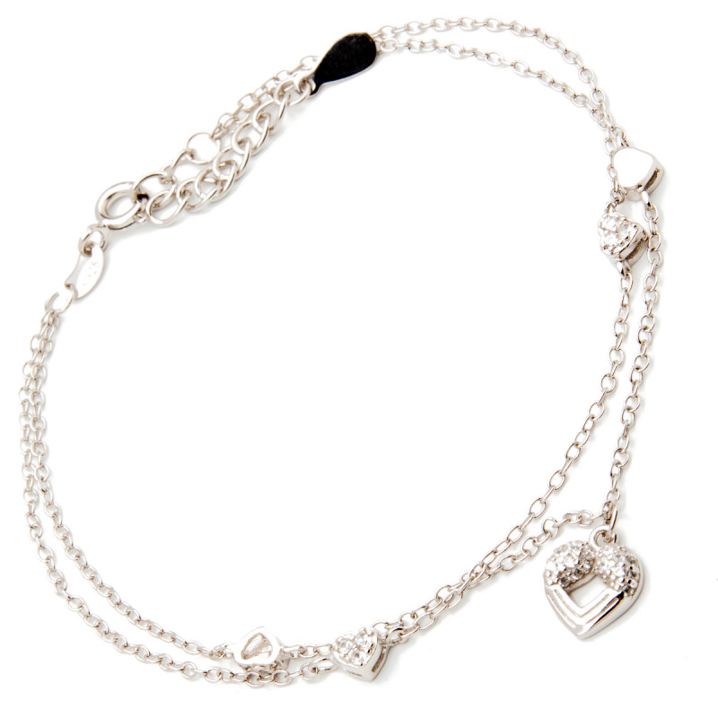 Srebrna bransoletka z podwójnym łańcuszkiem o splocie typu ankier i zawieszką z motywem serca. Wykonana z najwyższej jakości lśniącego srebra próby 925. Fabrycznie nowy.