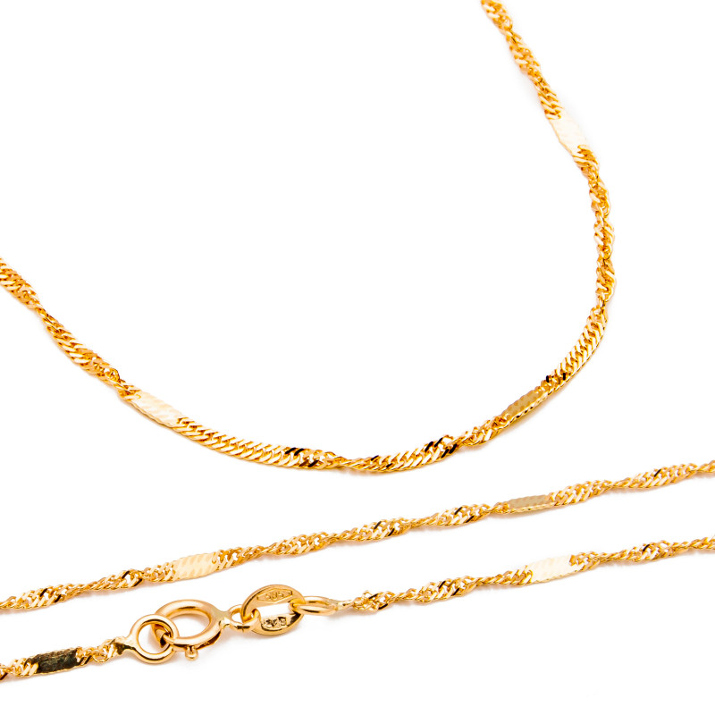 Złoty łańcuszek ze splotem typu singapur z ozdobnymi złotymi blaszkami. Wykonany z najwyższej jakości lśniącego złota próby 585. Fabrycznie nowy.