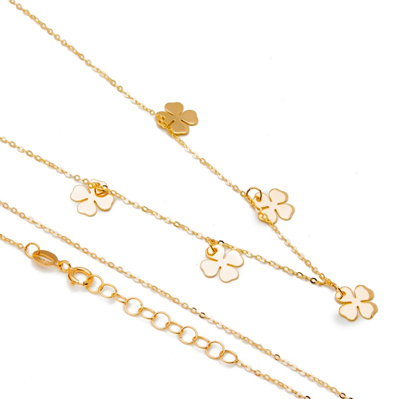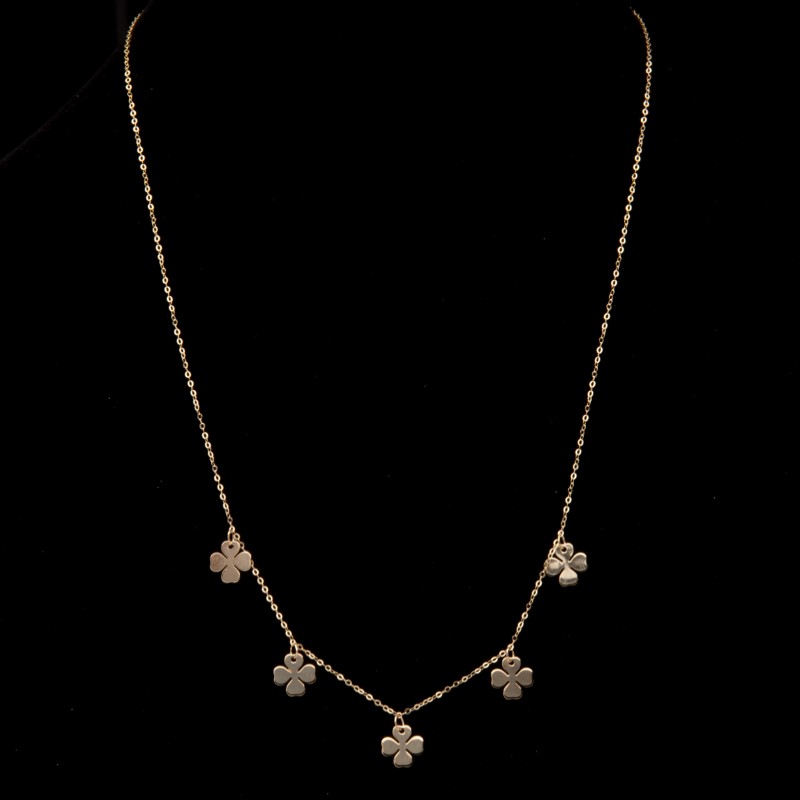 Złoty naszyjnik o klasycznym splocie typu ankier ze złotymi czterolistnymi koniczynami. Wykonany z najwyższej jakości lśniącego złota próby 575. Fabrycznie nowy.