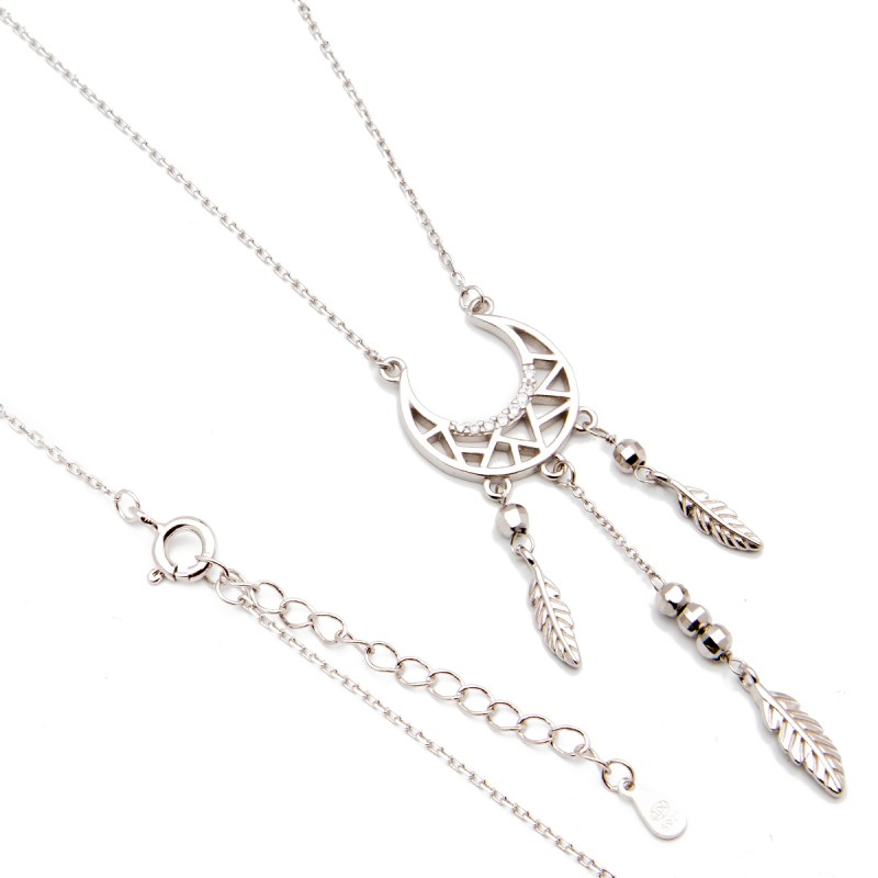 Srebrny naszyjnik z półksiężycem udekorowanym białymi cyrkoniami, zawieszkami i łańcuszkiem o klasycznym splocie typu ankier. Wykonany z najwyższej jakości lśniącego srebra próby 925. Fabrycznie nowy.