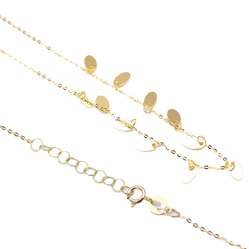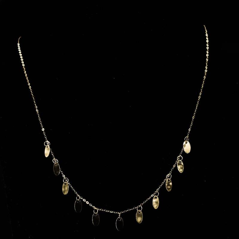 Złoty naszyjnik o klasycznym splocie typu ankier ze złotymi zawieszkami w owalnym kształcie. Wykonany z najwyższej jakości lśniącego złota próby 585. Fabrycznie nowy.