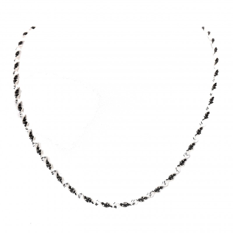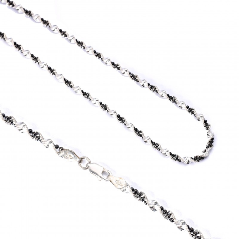 Srebrny naszyjnik ze srebrnymi segmentami ułożonymi w spiralę z czarnymi kulkami Wykonany z najwyższej jakości lśniącego srebra próby 925. Fabrycznie nowy.