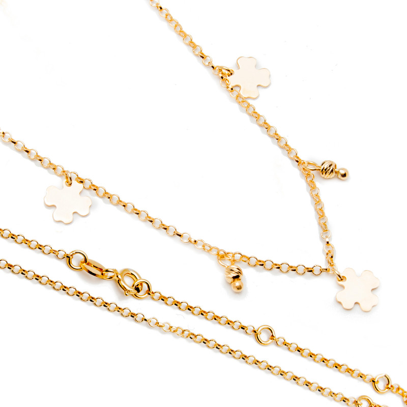 Srebrny pozłacany naszyjnik z pozłacanymi koniczynami i łańcuszkiem o klasycznym splocie typu ankier. Wykonany z najwyższej jakości lśniącego pozłacanego srebra próby 925. Fabrycznie nowy.