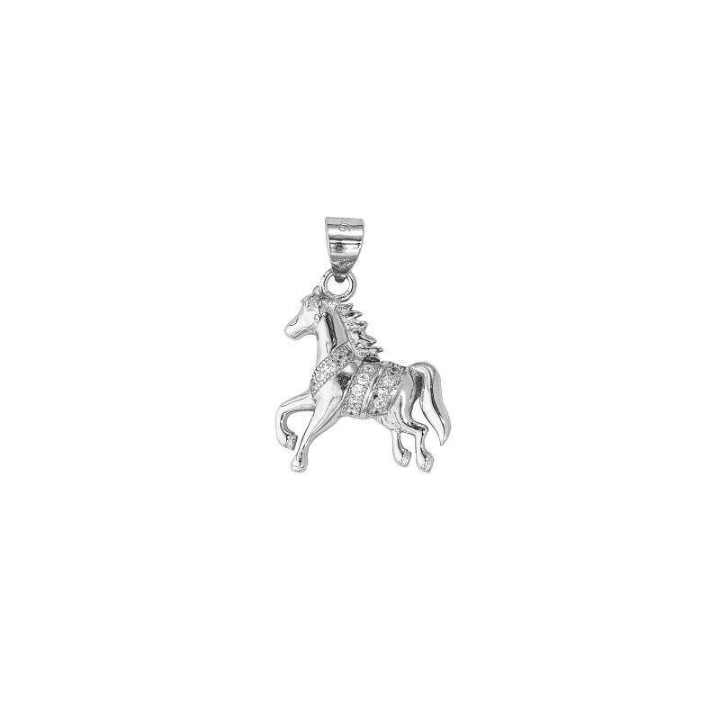 Srebrny wisiorek z galopującym koniem z białymi cyrkoniami. Zawieszka została wykonana z największą precyzją z najwyżej jakości lśniącego srebra próby 925.