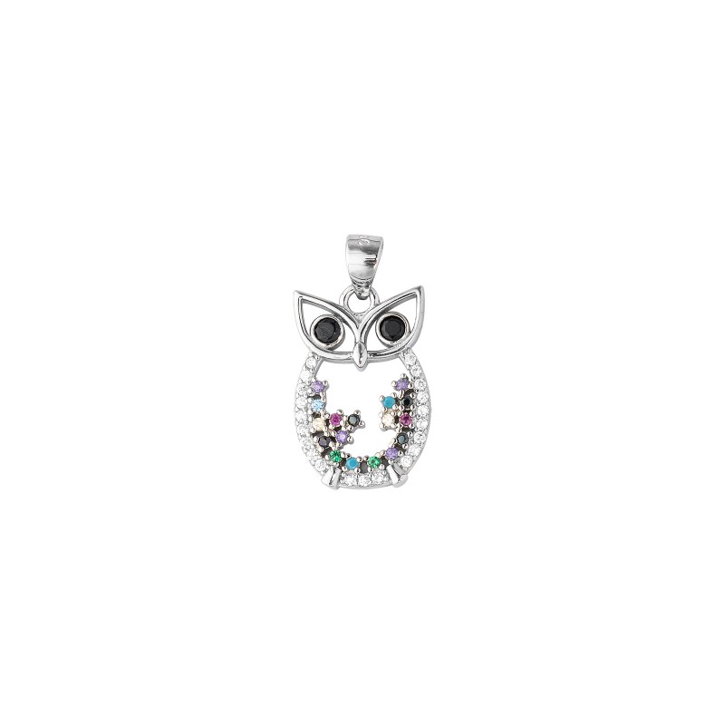 Srebrny wisiorek z sową wypełnioną kolorowymi cyrkoniami. Zawieszka została wykonana z największą precyzją z najwyżej jakości lśniącego srebra próby 925.