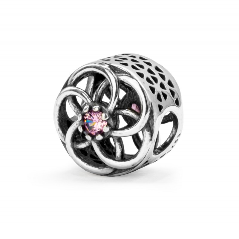 Zawieszka - Ażurowy Charms z motywem wirującego kwiatka w środku z jasno- różową cyrkonią