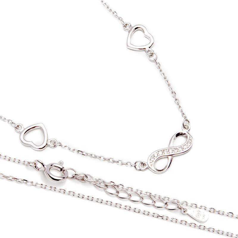 Srebrny naszyjnik ze znakiem nieskończoności, serduszkami i łańcuszkiem o klasycznym splocie typu ankier. Wykonany z najwyższej jakości lśniącego srebra próby 925. Fabrycznie nowy.