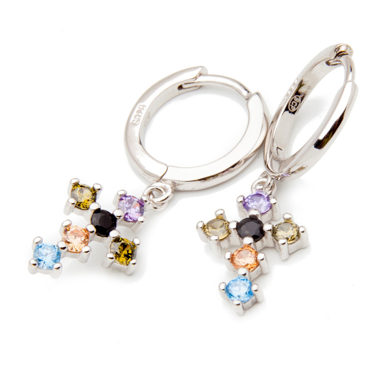 Srebrne kolczyki z krzyżykiem z kolorowymi cyrkoniami. Wykonane z lśniącego srebra próba 925. Fabrycznie nowe.