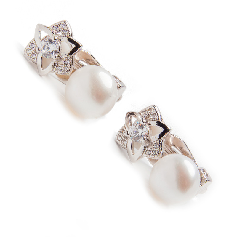 Srebrne kolczyki klips z cyrkoniami i perłą.