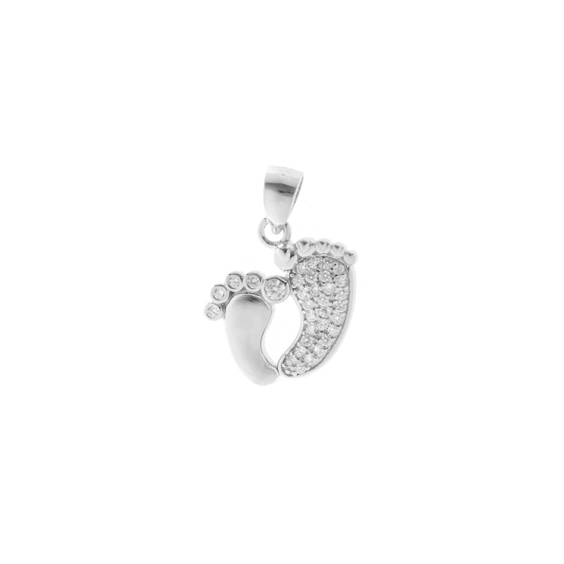 Urocza zawieszka w kształcie dziecięcych stópek to subtelna i pełna czułości biżuteria, idealna na prezent dla młodej mamy lub jako pamiątka narodzin. Jedna ze stópek ozdobiona jest w całości lśniącymi, białymi cyrkoniami, które pięknie odbijają światło. W drugiej stópce błyszczą cyrkonie ułożone w miejscu paluszków, dodając całości lekkości i wdzięku. Zawieszka wykonana została z wysokiej próby srebra, co gwarantuje trwałość i elegancki wygląd. To wyjątkowy symbol miłości i delikatności, który będzie towarzyszył na co dzień lub przy szczególnych okazjach. Doskonała jako osobista pamiątka lub wzruszający prezent z serca.