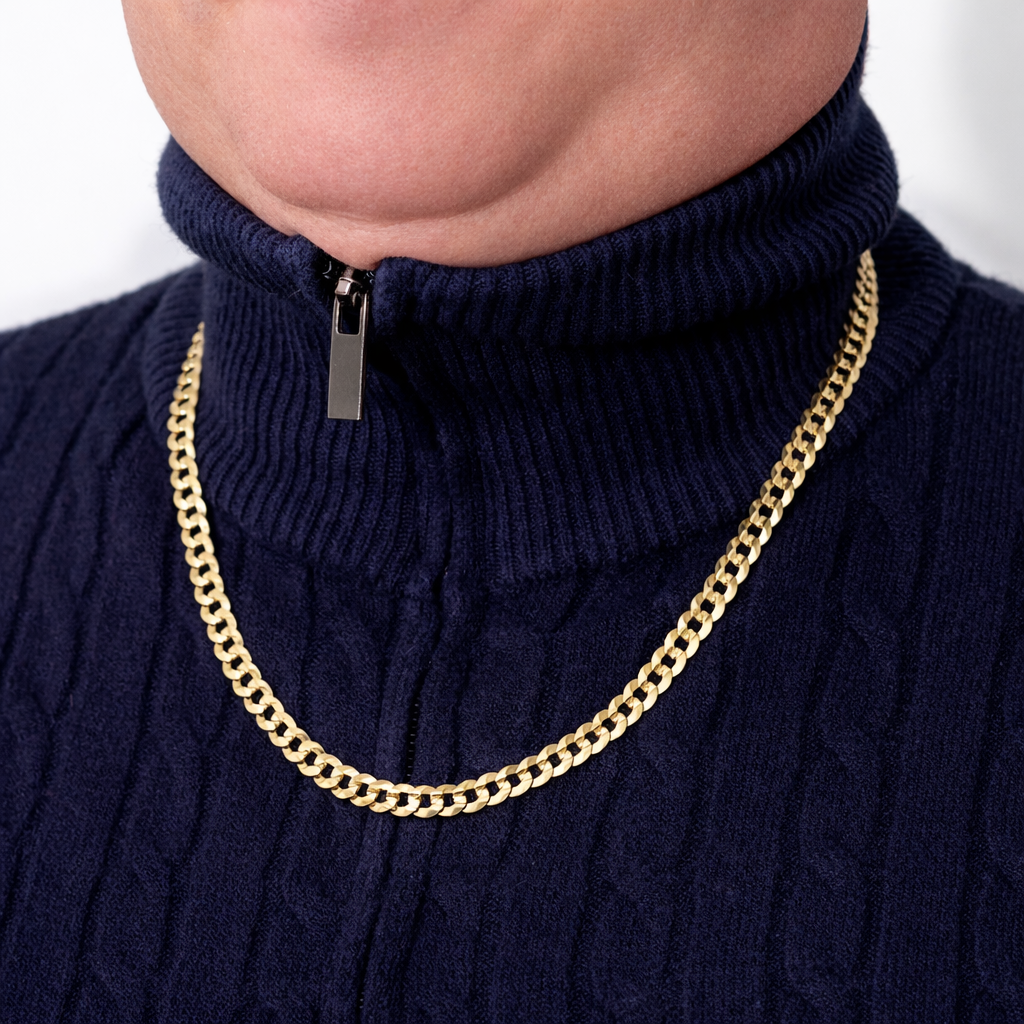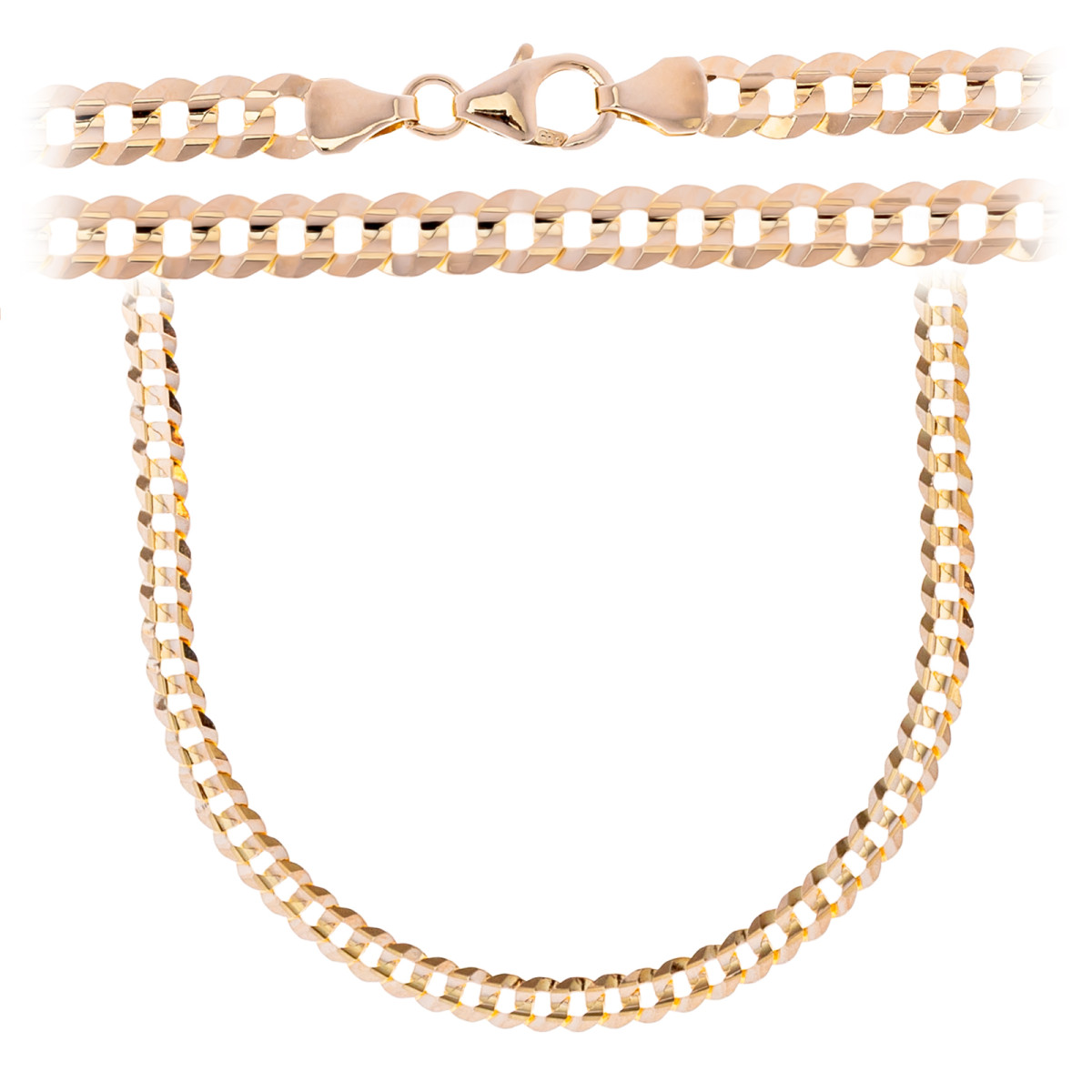 Splot Pancerka wyróżnia się płaskimi, gęsto ułożonymi ogniwami, dzięki czemu łańcuszek pięknie układa się na szyi i efektownie odbija światło.