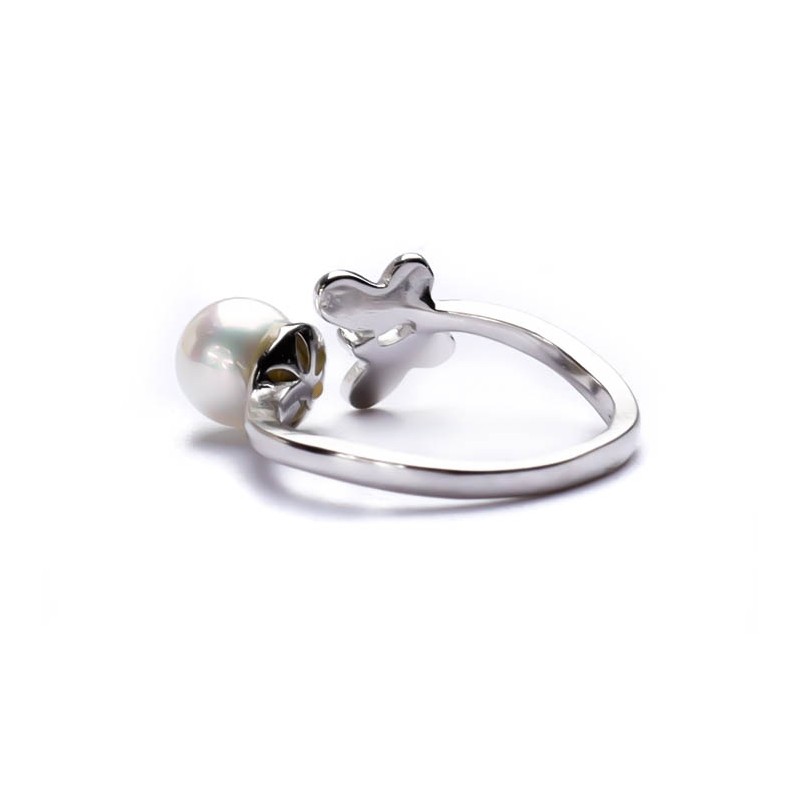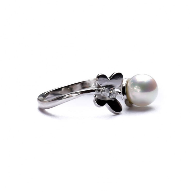Srebrny pierścionek z pięknym motylkiem o rozłożonych skrzydłach gotowych do lotu z białą, błyszczącą cyrkonią i perełką o średnicy 6 mm. Wykonany z najwyższej jakości lśniącego srebra próby 925. Fabrycznie nowy.