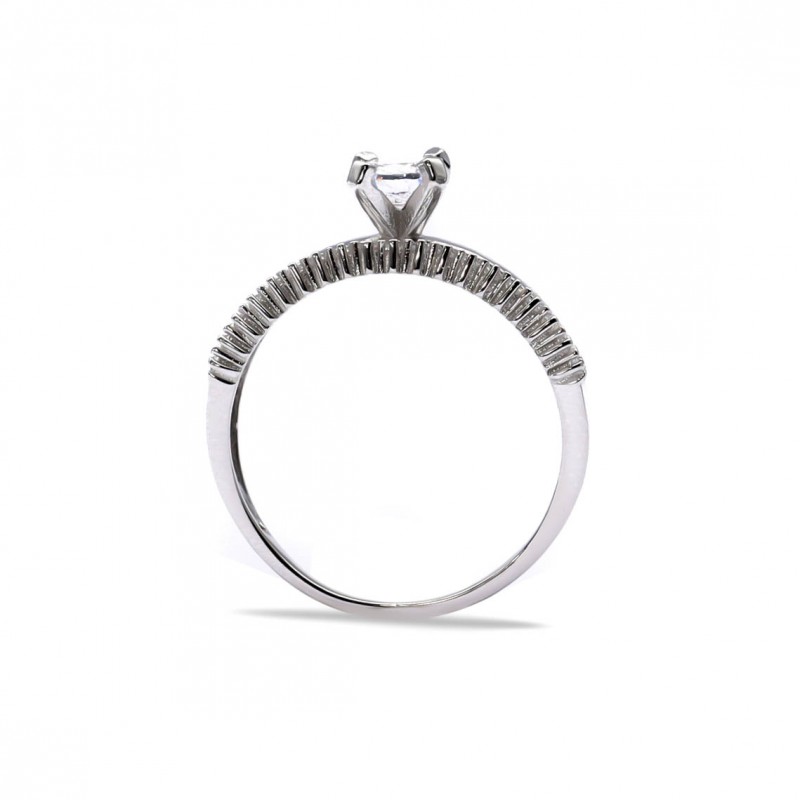 Srebrny pierścionek z dużą cyrkonią na nóżkach z podwójnymi obręczami wyłożonymi białymi mniejszymi cyrkoniami. Wykonany z najwyższej jakości lśniącego srebra próby 925. Fabrycznie nowy.