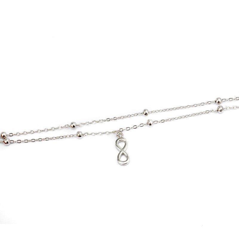 Srebrna bransoletka z podwójnym łańcuszkiem typu ankier, koralikami i zawieszkami ze znakiem nieskończoności. Wykonana z najwyższej jakości srebra próby 925. Fabrycznie nowa.